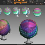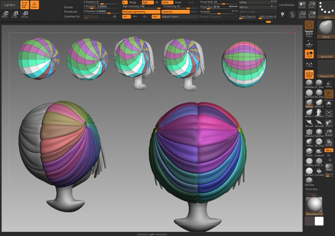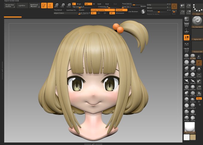 ツインテ後頭部の作り直しテスト ふつうに球の半分twistして形整えるだけ 厚み付ける直前までは1メッシュなので グループで分割後の太さに容易に調整かけられるし 逆側のシンメトリ崩したい部分はその段階で手をいれたほうがいいね #zbrush