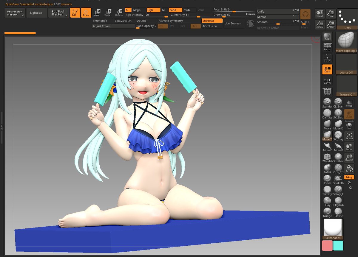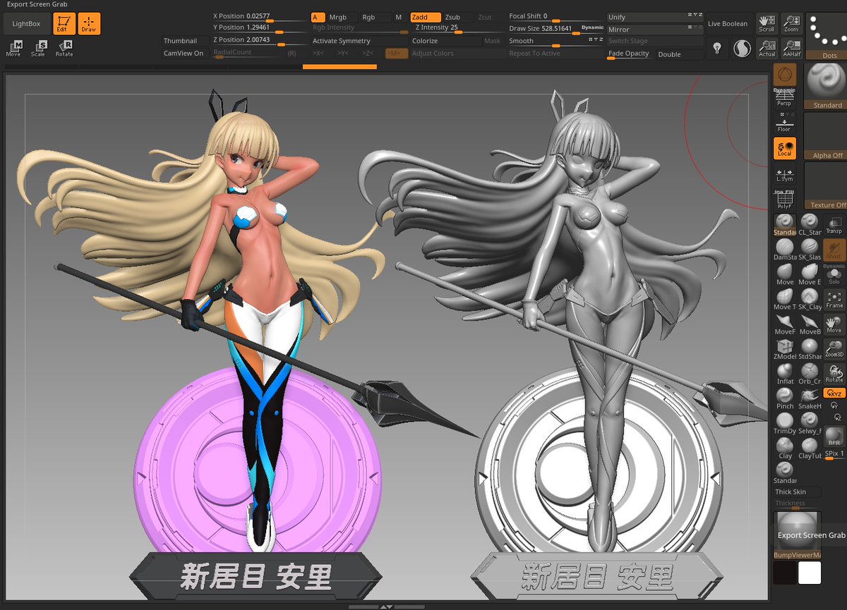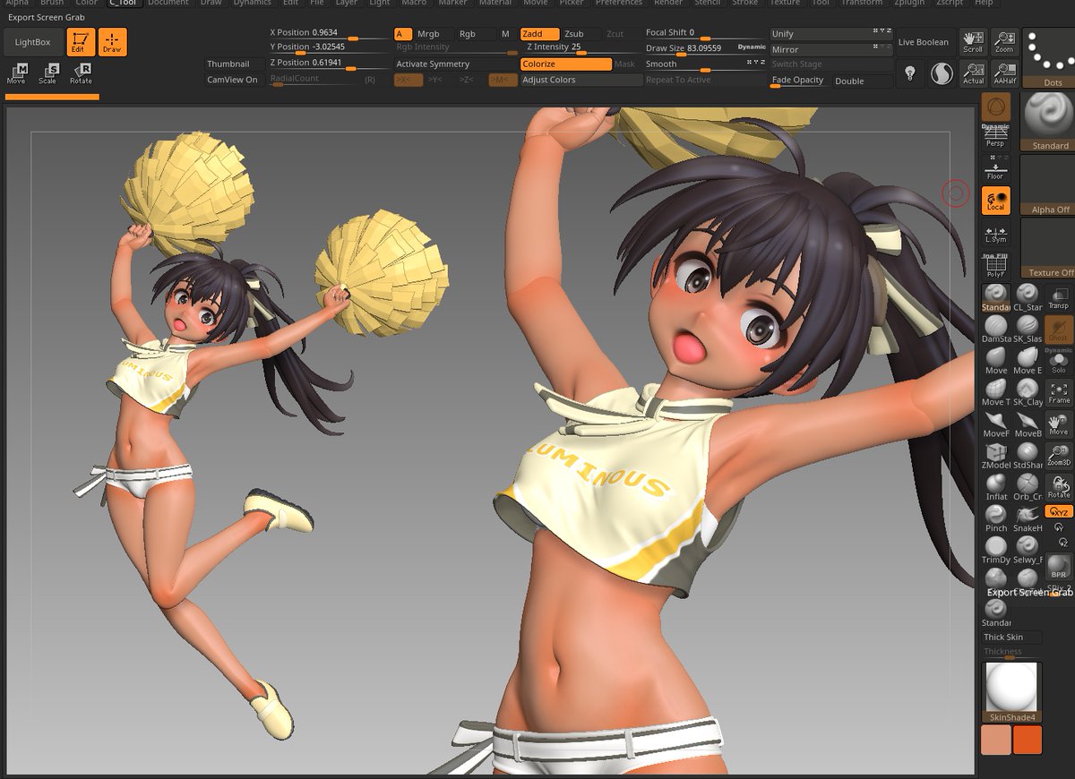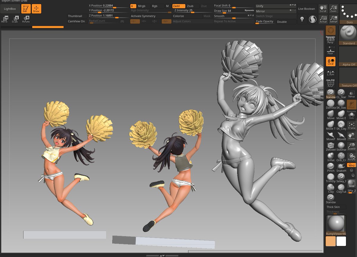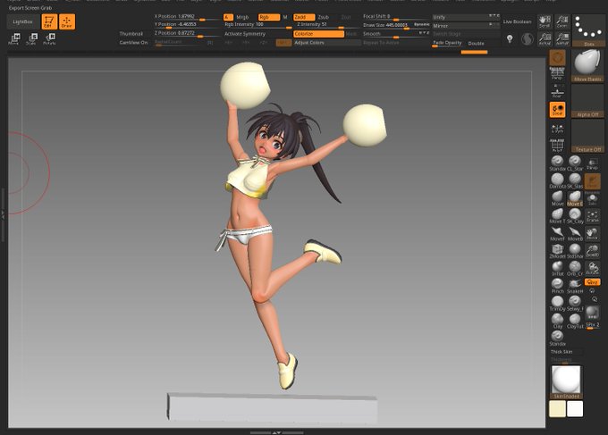 37 158 マナちゃん進捗 肩~脇の部分だとか髪の毛とか腕周りとかつくりこみ 完成の時は近い… と思いきゃ足の角度ちょっと変えて様子見してまた時間が吸われる そこ確定させたら後は最後のポンポン #zbrush 22/10/26 17:45