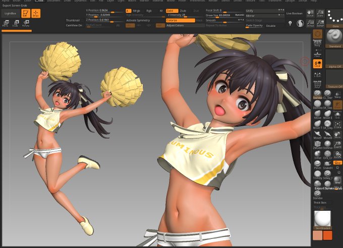 マナちゃん進捗 肩~脇の部分だとか髪の毛とか腕周りとかつくりこみ 完成の時は近い… と思いきゃ足の角度ちょっと変えて様子見してまた時間が吸われる そこ確定させたら後は最後のポンポン #zbrush