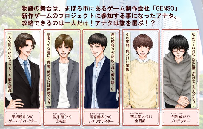 フォロワーさんの性癖を込めた男を描かせてもらいました。 せっかくなので恋愛ゲームっぽく並べて人気投票してみようという事になりまして…(´>∀<`)ゝ パッと見の印象で気軽にポチッとしてもらえたら嬉しいです。 投票はリプ欄に(6項目あるので)続きます。