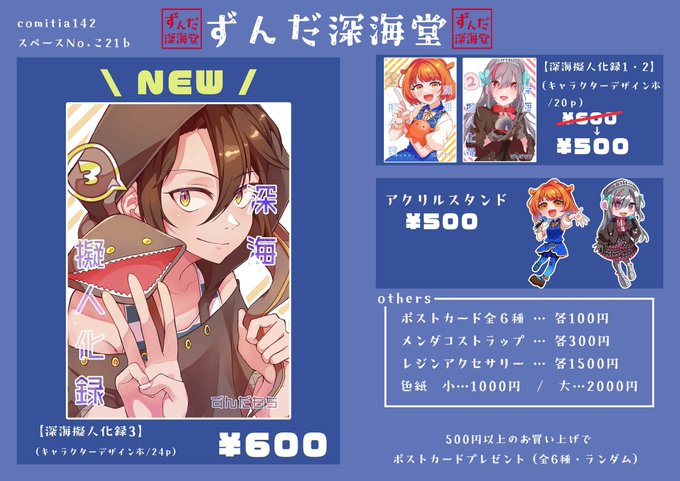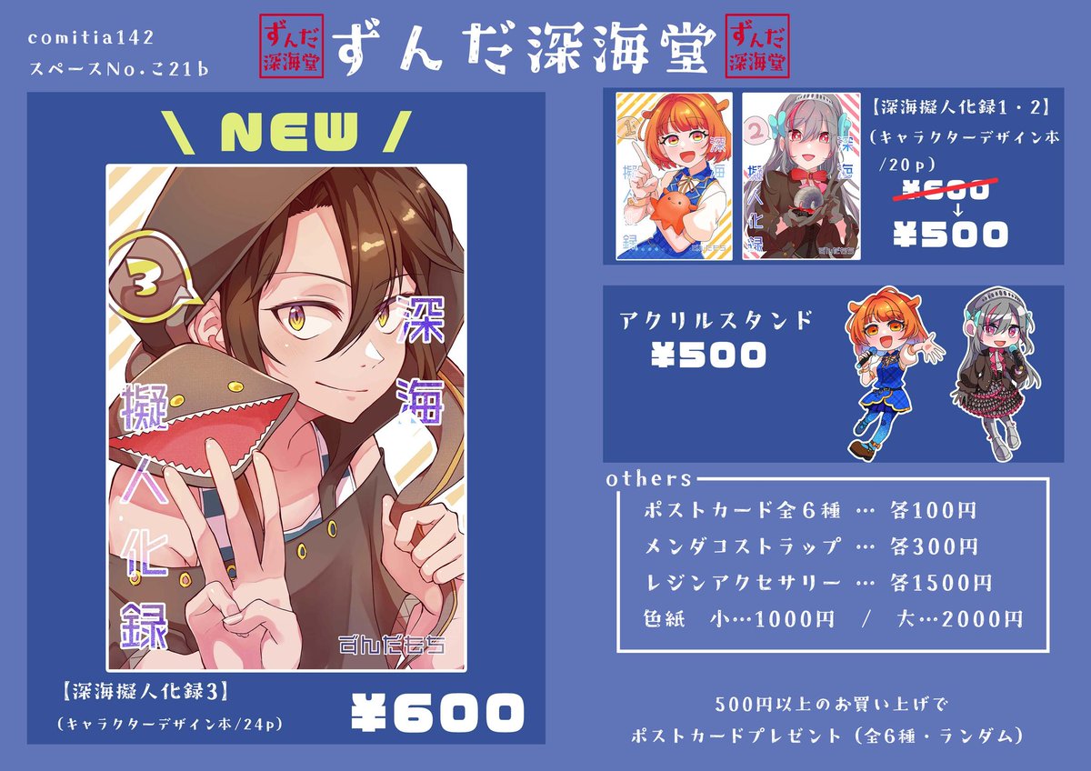 明日のコミティアのお品書きです! ◇11/27(日)COMITIA142◇ [スペースNo.こ21b] サークル名【ずんだ深海堂】にてお待ちしております! 新刊刊行にあたり既刊を値下げしましたので、ぜひこの機会にお立ち寄り下さいー!!🙌 (深海生物の色紙もあるよ〜) #コミティア142 #COMITIA142