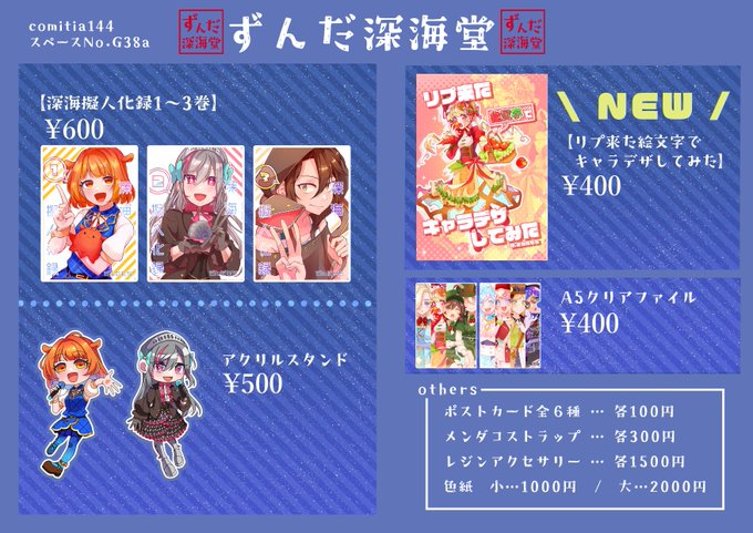 📣コミティアお品書き📣 スペースNo.【G38a】ずんだ深海堂 --------------------------------------------- あさって5/5開催、 コミティア144に出展します! 新しくなった「深海擬人化録」や絵文字キャラデザ本と共にお待ちしております~!✨ #COMITIA144お品書き #コミティア