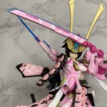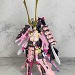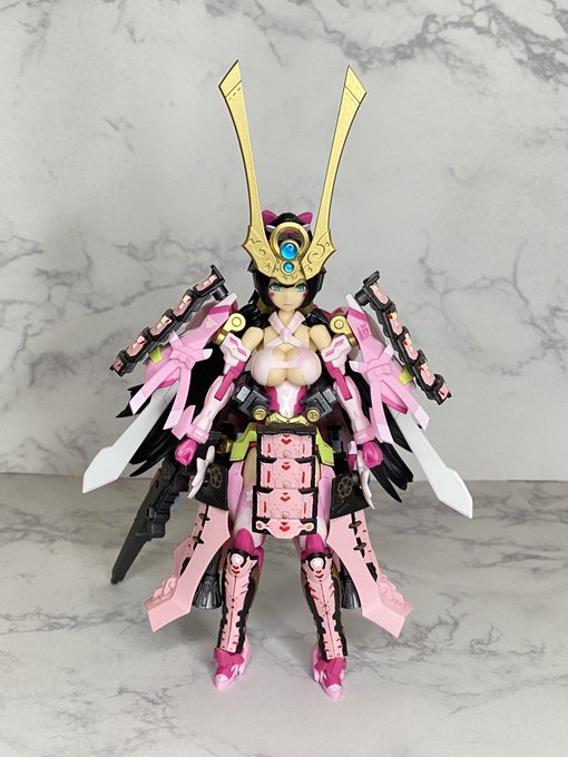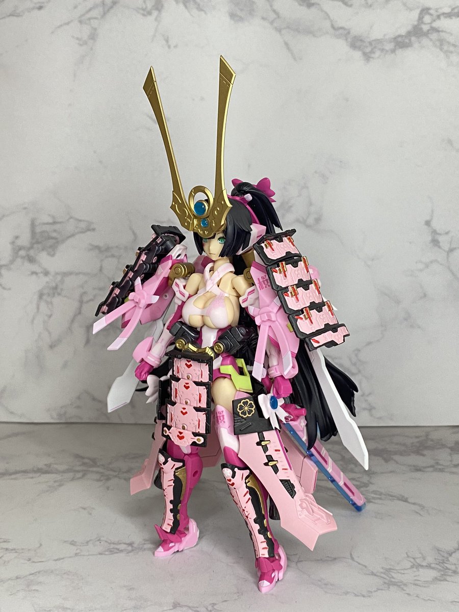 メガミデバイス8体目 朱羅 弓兵 桜鬼改め 「朱羅 桜姫 比奈守桜子 桜鎧兵装(あすら おうき ひなのかみさくらこ おうがいへいそう)」 完成。 元の弓兵桜鬼をベースに髪型と髪の色を変更し、手持ちのMSGや余りパーツなどを使って簡単に追加武装してみました。 #メガミデバイス