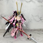 20 90 メガミデバイス8体目 朱羅 弓兵 桜鬼改め 「朱羅 桜姫 比奈守桜子 桜鎧兵装(あすら おうき ひなのかみさくらこ おうがいへいそう)」 完成。 元の弓兵桜鬼をベースに髪型と髪の色を変更し、手持ちのMSGや余りパーツなどを使って簡単に追加武装してみました。 #メガミデバイス 23/04/16 18:54
