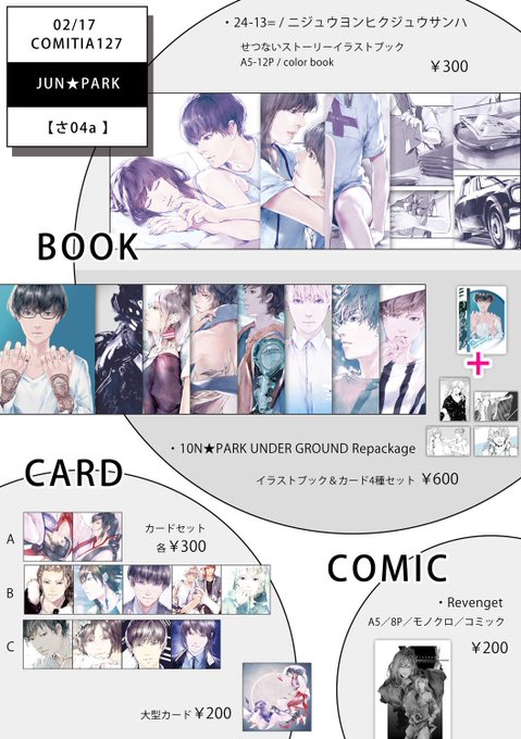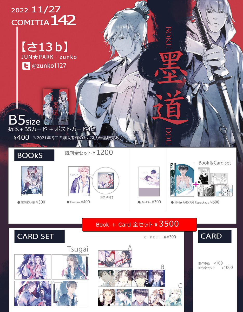 11月27日 COMITIA142 【さ13b】JUN★PARK −−−−−−− 既刊のみです。新作ありません。 前回COMITIAの新作ポスカセット(¥300)持っていきます。 お得な全部セットをご用意してます。よろしくお願いします #junpark_zunko #COMITIA142