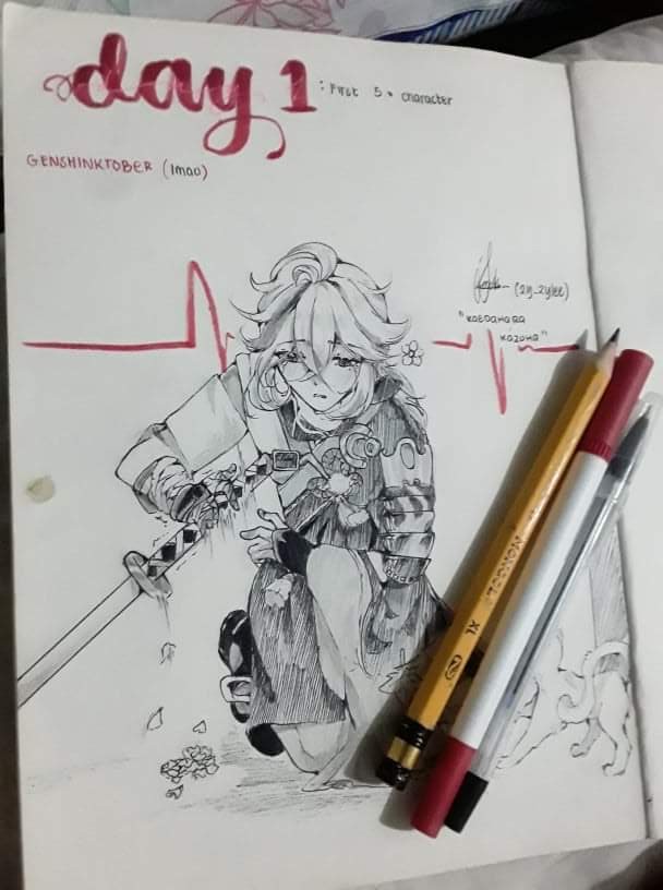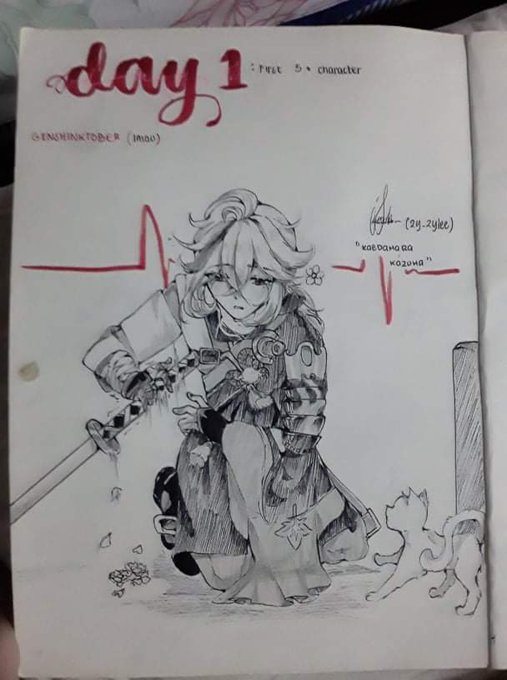 I— am dropping #genshinktober due to school and another inktober I’m more enthusiastic to join but here’re the only days I did TvT (repost aaa I forgot the hashtags-) Day 1: First 5* #Kazuha #KaedeharaKazuha #genshin #genshinimpact #fanart #inktober #traditional [🧵]