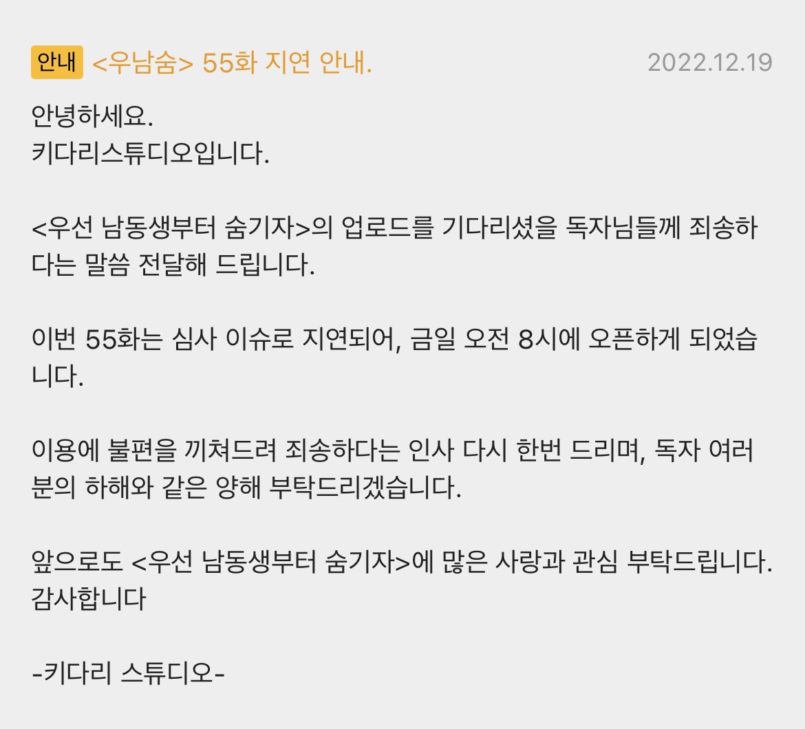 ✨ 우선 남동생부터 숨기자 55화 업데이트 되었습니다! 심사가 늦어져 업로드가 지연 됐었다고 하네요...^^ (*다음주는 정기 휴재입니다!) 🅚 page.kakao.com/home?seriesId=… Ⓚ webtoon.kakao.com/content/%EC%9A…