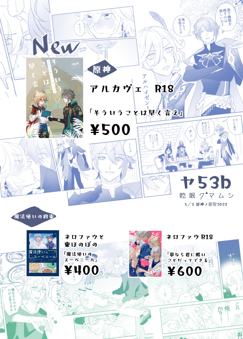 5/3 超神ノ叡智2023 東3ヤ53b 乾眠クマムシ 新刊◆そういうことは早く言え 原神アルカヴェ 既刊◆まほやくのネロファウ本も少し持っていきます よろしくお願いします! pixiv.net/artworks/10773… ec.toranoana.jp/joshi_r/ec/ite…