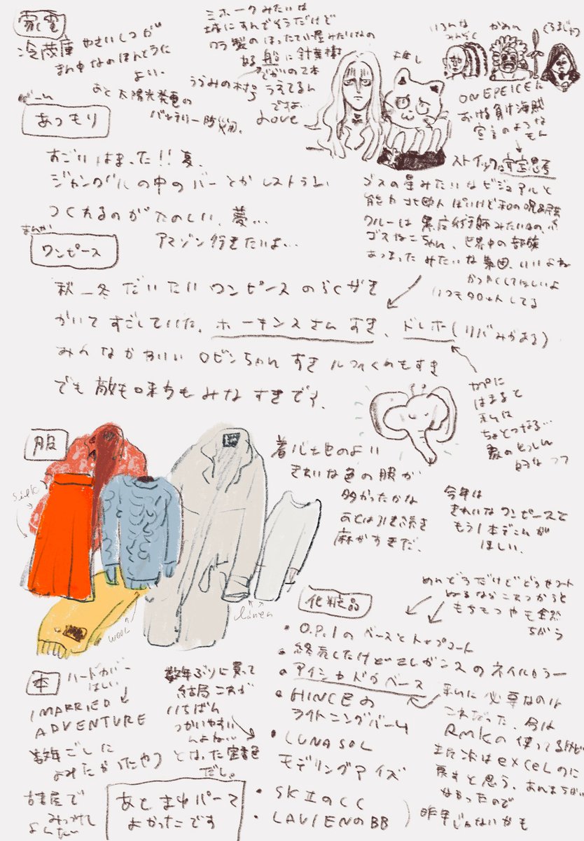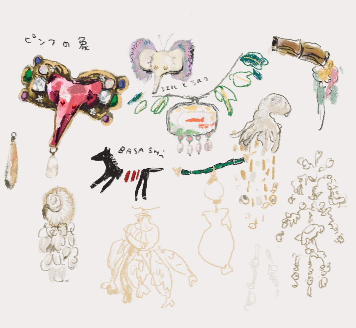 年明けに描いてたなんかおすすめと買ってよかった物の振り返りのやつ 半分くらいワンピースの推しの話してる あと最近いろんなやつのすみっことかに描いたりしていたジュエリーらくがきぽいのを適当に寄せ集めたやつ