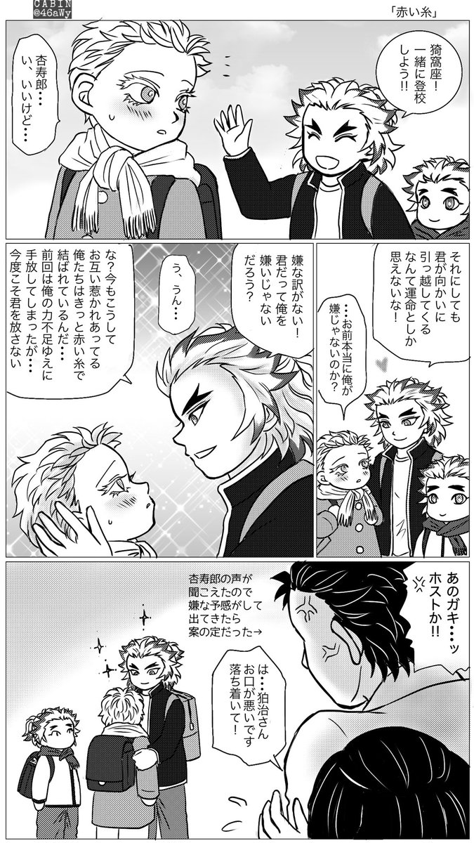#煉猗窩版ワンドロワンライ 「赤い糸」+1.5h 現パロ先週の続きです 小学生ホスト🔥くん爆誕💥? いやいや、本人はいたって真剣に口説いてます! ちなみに🔥くん小5、❄️くん小3、千くん小1くらいのイメージです twitter.com/46aWy/status/1…