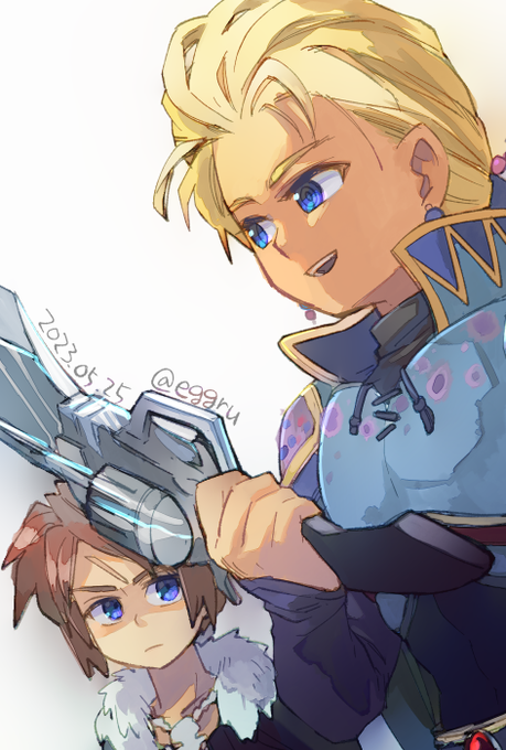 【FF6/エドガー・FF8/スコール】 変わった武器だね、分解してみて良いかい??? DFFは10代のキャラも多いのでエドガーの年齢と地位なりの落ち着きが際立ってて良い~~スコールみたいな子とも難なく付き合えるんだろな。 #eggru_ワンドロ