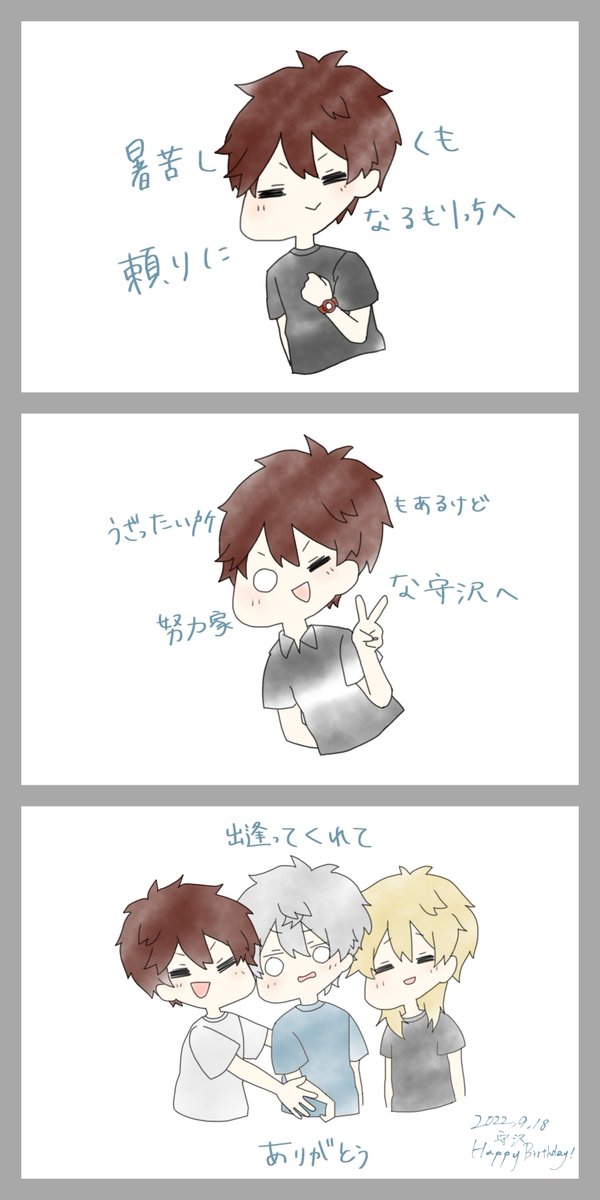 遅刻した〜! もりさわ!!誕生日おめでとう🎉🎂🎉 季節感ガン無視だけど 関西はまだ熱中症警戒アラートとか出てて全然レッドホット🔥だからゆるちて〜 幸せになってね✋ ポテトくれ〜🍟 #守沢千秋誕生祭2022 #守沢千秋生誕祭2022