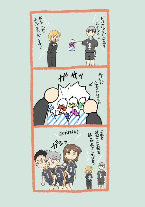 3コマの続き的に…😂 みんなでやっちゃんヘア♫w ✏️時間なくて全員ただのTシャツ🙇♀️ 最近のプリクラ事情は無知なので、若者とズレがあるかもですが💧私の時代のプリクラ風らくがき入りお誕生日絵🎂w 烏野大好きっす♡♡♡ やっちゃんの親友になりたい←(これ1番の憧れ) #谷地仁花誕生祭2022