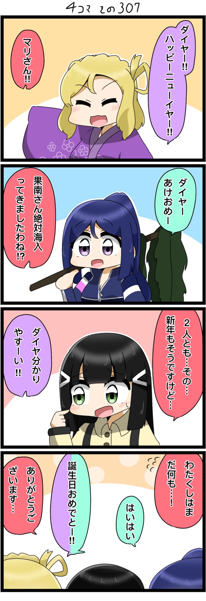 今日の4コマです✨ あけましておめでとうございます とダイヤさん誕生日おめでとうございます!!!!💎🌸㊗️🥳🎂🎉 #lovelive #Aqours #黒澤ダイヤ生誕祭2022 #黒澤ダイヤ誕生祭2022