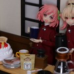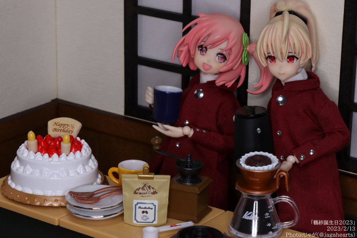 「鶴紗ちゃん、お誕生日おめでとう!」 「ありがとう梨璃。コーヒーを淹れて一緒に食べましょうか。」 #安藤鶴紗誕生祭2023 #安藤鶴紗生誕祭2023 #アサルトリリィ #アサルトリリィドール部 #たづりり たづりり (ナイトルージュ衣装 @alpha_san_desu さん)