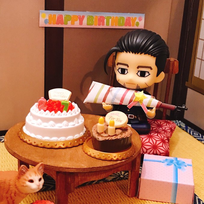 #尾形百之助誕生祭2022 #尾形百之助生誕祭2022 お誕生日おめでとう尾ちゃん☺️🎉 欲しかった最新式の銃も貰えて良かったねぇ☺️ケーキもイチゴかチョコ、選べなかったから両方もらえたんだね良かったね☺️ゆうさく(猫)も一緒にお祝いしてくれたね嬉しいね☺️🎉