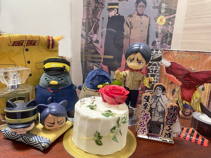 今年もケーキと祭壇でお祝いします!!!! この一年で金カムも鯉ちゃんもグッズ展開増えて嬉しい☺️💜 鯉ねんどろも軍服着用に進化させた✨ #鯉登音之進生誕祭2021 #鯉登音之進生誕祭2021