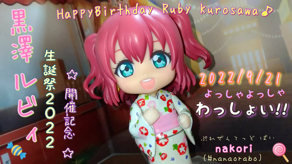 本日9/21はAqoursの可愛いだけじゃないw妹ちゃんな黒澤ルビィ嬢の誕生日ですね🍬 今年はよっしゃ×2なwお祭り浴衣姿でお祝いです🏮 ルビィちゃんお誕生日おめでとうございます〜🍭(≧▽≦)🎉 #黒澤ルビィ生誕祭2022 #黒澤ルビィ誕生祭2022 #小さなラブライブ #ラブライブサンシャイン #ねんどろいど