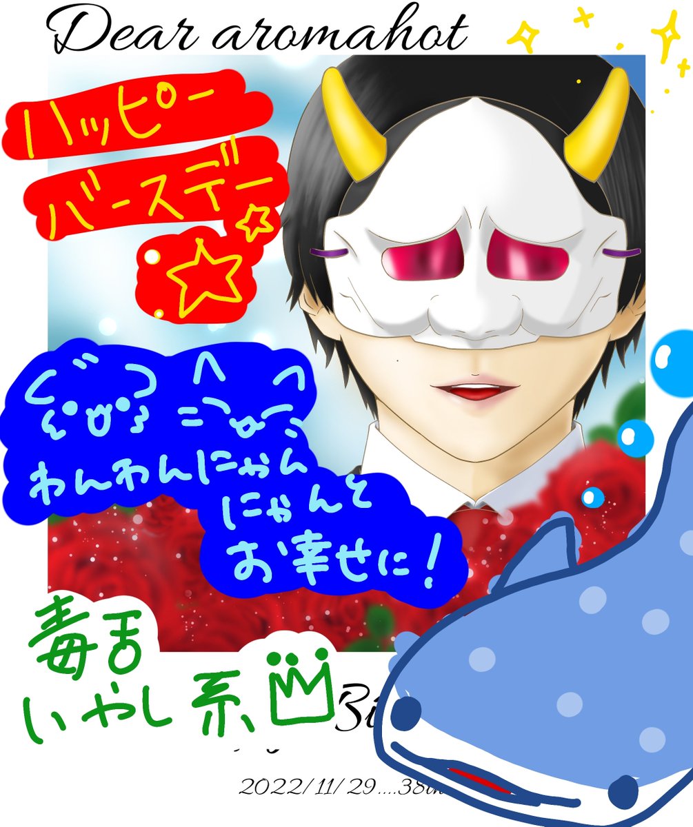 *.。☆゜ .。*.゜☆.* お誕生日おめでとうございます🙌💕 わんわんにゃんにゃんとともに また1年楽しく笑顔の絶えない日々を 過ごせますように…✨🐶👹🐱✨ *.。☆゜ .。*.゜☆.* #あろまほっと生誕祭2022 #あろまほっと誕生祭2022 #11月29日はあろまほっとの誕生日 #毒舌癒し系誕生祭 #MSSPアート