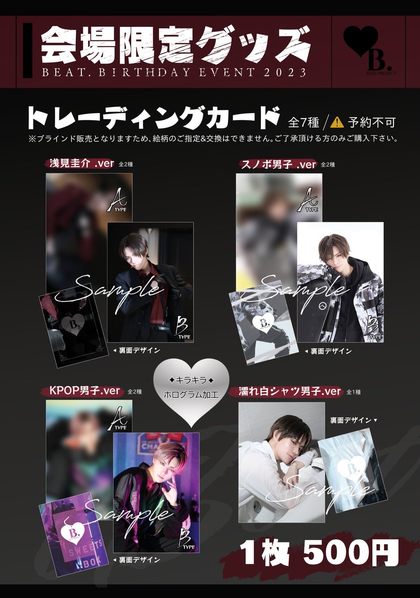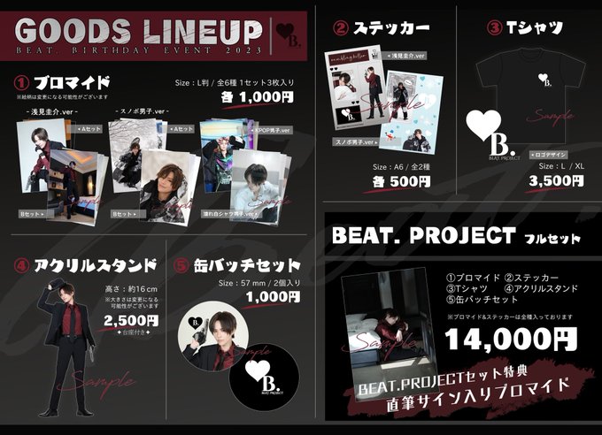 #びぃと生誕祭2023 当日のグッズラインナップです✨ ①アクリルスタンド ②限定Tシャツ ③ステッカー 2種 ④缶バッジセット ⑤ブロマイド 6種 ❻フルセット👑 ★特典付き★ →①〜⑤が全て入ったフルセット! ⑦トレーディングカード※ (⚠️フルセットには含まれません、予約不可) 是非GETしてね💖