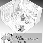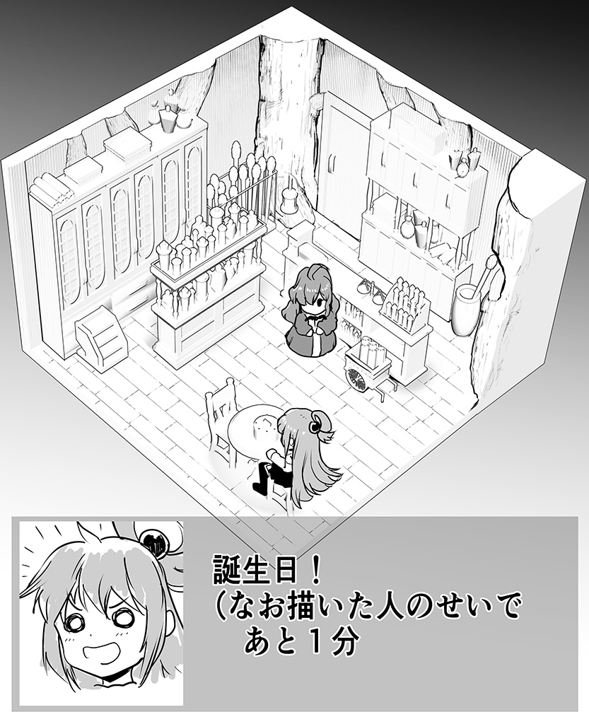 #アクア生誕祭2022 #アクア誕生祭2022 アクア誕生日、 今年はウィズから祝われるバージョン。 最初に作ったのが2枚目 アクアがあまり目立ってないな、と思って 1枚目を追加 2枚目の3D背景頑張って作った意味があまりないけど…苦労したので2枚目も載せます。 クォータービュー(マリーのアトリエ風)