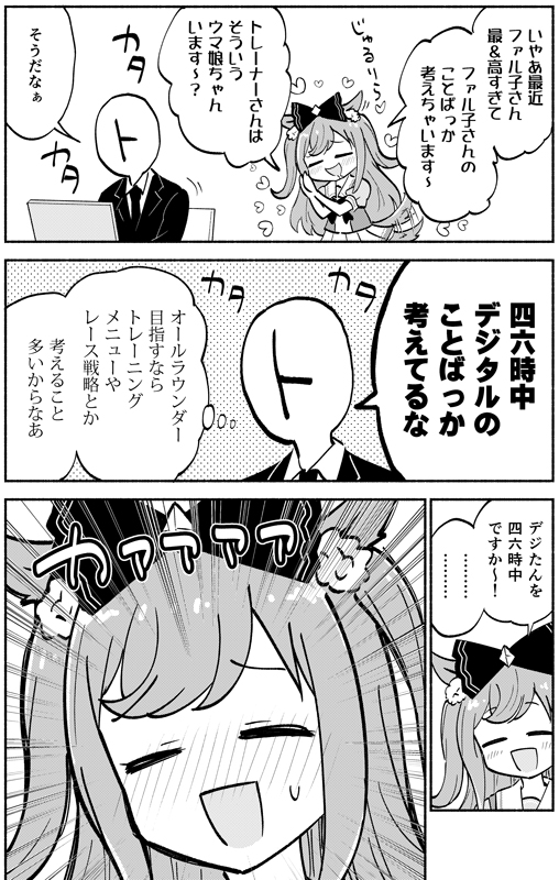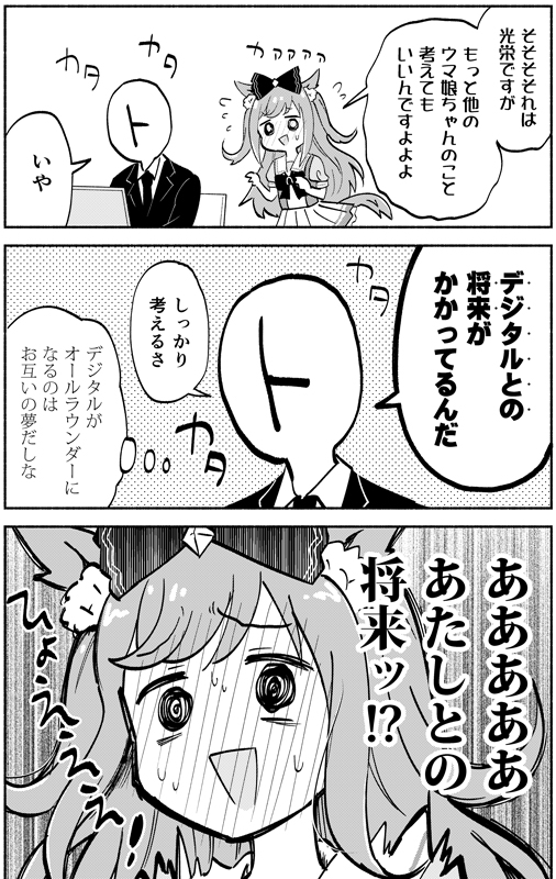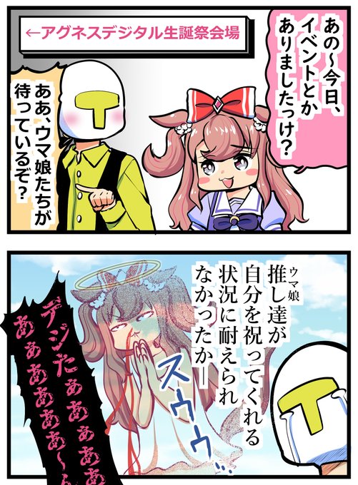 こちらは「自分如きに向けられるはずのないクソデカ感情を大量に浴びて、ただただ怯えることしかできないアグネスデジタル」でございます 遅れちゃったけどデジたん誕生日おめでとう〜🎂 #ウマ娘 #アグネスデジタル生誕祭2022
