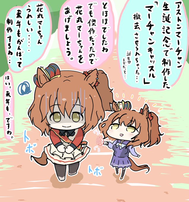制服マーチャンデフォルメCARと、レーシングマーチャン (1日出遅れ) #アストンマーチャン誕生祭2023 #アストンマーチャン生誕祭2023 #アストンマーチャン誕生祭 #アストンマーチャン生誕祭 #アストンマーチャン #ウマ娘モータリゼーション #デフォルメ #イラスト #アナログイラスト