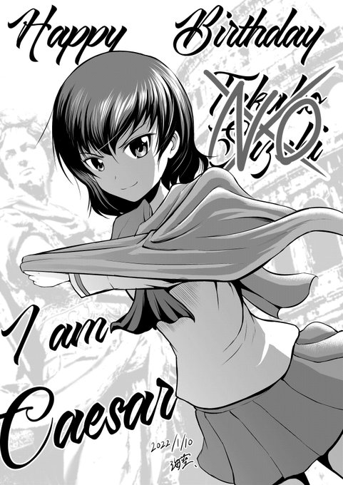 歴女チームはカッコよく! をイメージしているので、マント(というか襟巻?)を翻してるカエサルを描きました! たかちゃんじゃないですよ、カエサルですよ! カエサル、お誕生日おめでとうー! カバさんチームの活躍に期待しています!! #ガルパン #カエサル生誕祭2022 #カエサル生誕祭