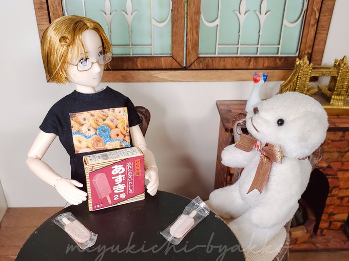 カナちゃんお誕生日おめでとうございます🥳👏🎉🎊🎂🎁 7月1日は井村屋あずきバーの日でもあるのでカナちゃんとクマ二郎さんに食べてもらいました✨ #マシュー生誕祭2023 #カナちゃん生誕祭2023