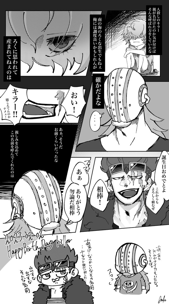 ビビに続いて2月2日はキラーさんの誕生日になります🥰 キラーお誕生日おめでとう🎂🎊🎉 「お前は悔いているんだろう?あの時の選択を!!お前が死ぬと恐れた未来をおれ達が生きてんだからな!!」 キッドの右腕キラー!好きやなぁ🥰 #ワンピース #ONEPIECE #キラー誕生祭2023 #キラー生誕祭2023