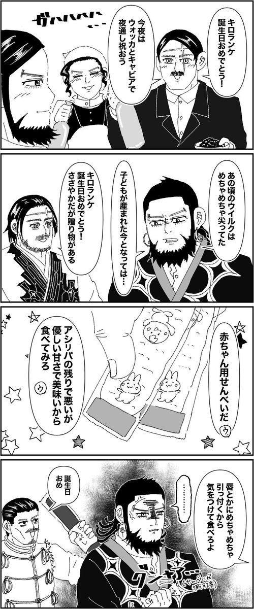 #キロランケ誕生祭2022 #キロランケ生誕祭2022 誕生日おめでとう🎉 優しくて大らかでカッコよくて色っぽい、ソフィへの憧れを抱き続けるロマンチストで、ウイに対しては愛憎深き一寸面倒な人でもある…複雑な顔を持つ魅力的な㌔ちゃんが大好きです!リパさんの選択や民族の未来を見届けて欲しかった😭