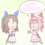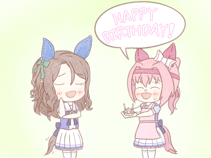 #キングヘイロー生誕祭2023 #セイウンスカイ生誕祭2023 「はい、キング、あーん」 「って!これ入り切らないサイズじゃ……モゴモゴ……」 「あははは!おめでとう、キング」 「あなたもね、スカイさん」 改めて2人ともおめでとう〜!!!!! #ウマ娘