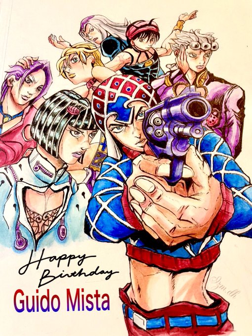 ミスタ3日遅れでおめでとう🎂🎉✨ 4日遅れじゃあなくてよかった💦💦💦 ほとんど公式からの模写ですが ケーキのいちごだけどケーキがない😅 誕生日なのでピストルズもカラフルにしてみました💓 #グイード・ミスタ誕生祭2022 #グイード・ミスタ生誕祭2022
