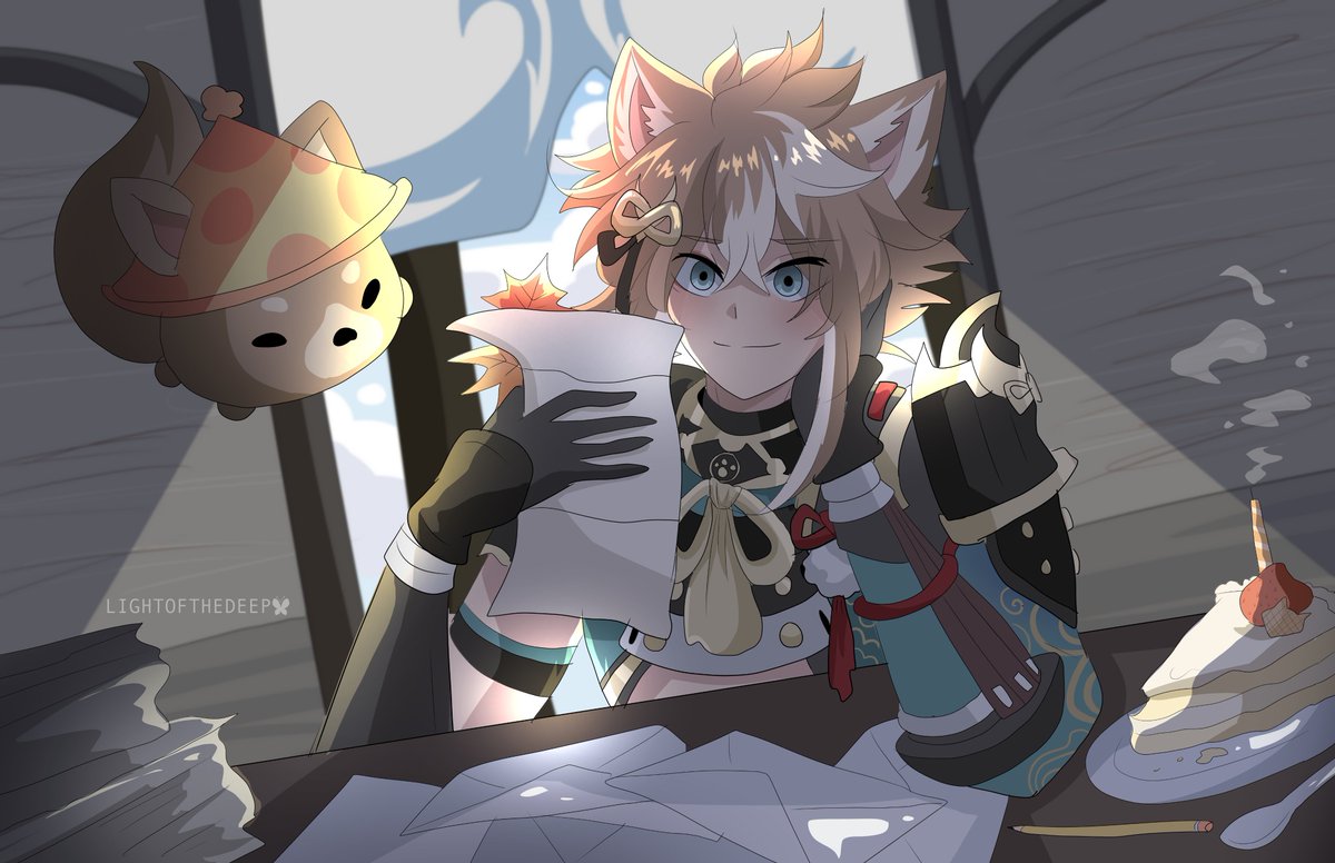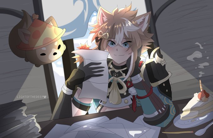 belated happy birthday to our beloved general!! 🎂 his friend came back from the sea to help him celebrate~ let's hope he gets his fill of sweets just once in a while 🤭 #ruiるいfanart #gorou #ゴロー生誕祭2022 #kazugorou #原神 #原神イラスト #genshinimpact #genshintwt