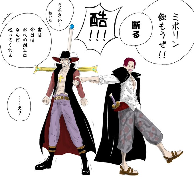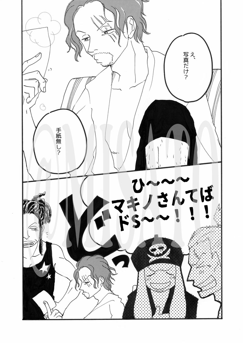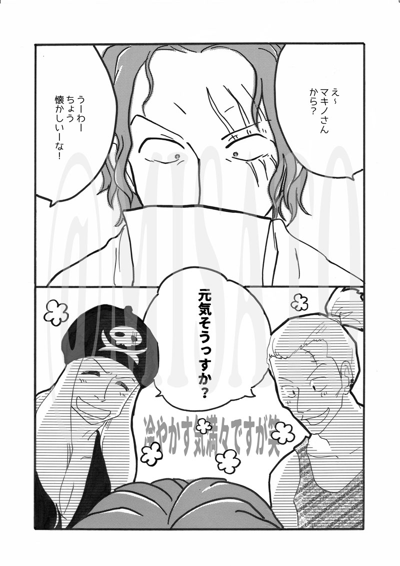 お頭、おめでとさん 既刊からちょっとだけ公開なシャンマキっぽいの4ページ こんな感じだったら笑えるって妄想です カッコいいシャンクスは、おれには描けないんだぜ(笑) #シャンクス生誕祭2022 #シャンクス誕生祭2022