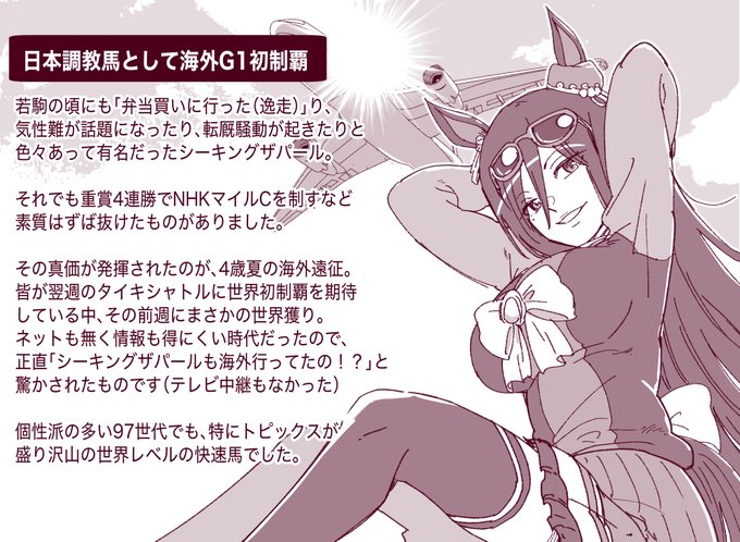若駒の頃はおてんば娘扱いされていましたが、古馬になってからは世界レベルの活躍を見せたシーキングザパール。短距離の差し追い込みという貴重な特性を有しているので、ウマ娘実装も待たれますね。 #ウマ娘 #シーキングザパール生誕祭2022