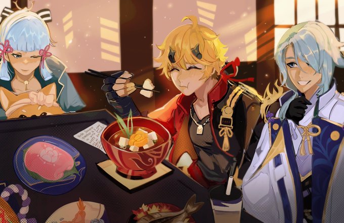 Happy Birthday to the sweetest bean and best housekeeper Thoma 🥨🧋 Ayato - @Sytosik Ayaka - uyu.cos (IG) Thoma - Me #トーマ生誕祭2023 #thoma #原神 #Genshinlmpact #Ayato #ayaka