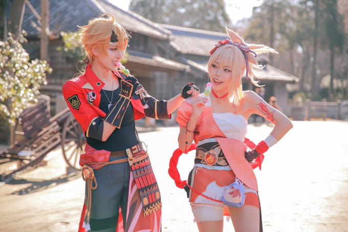 【コスプレ】 原神 稲妻 トーマお誕生日おめでとう🐶👏🏻🎉 トーマ・女将(@okamix123 ) 宵宮・こより Photo by まっきーさん(@Mackey_TB ) #トーマ生誕祭2022 #トーマ誕生祭2022 #Yoimiya #Thoma #Gensinimpact