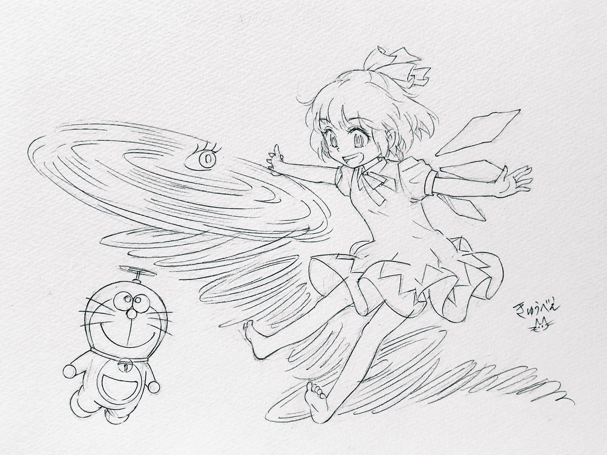 ドラえもんの誕生日に東方キャラと絡めてイラストを描くのが楽しみなんだけど、毎年9/3に間に合わない せめて線画だけでも・・・ フー子は初めて泣いた漫画 #ドラえもん生誕祭2021 #東方project