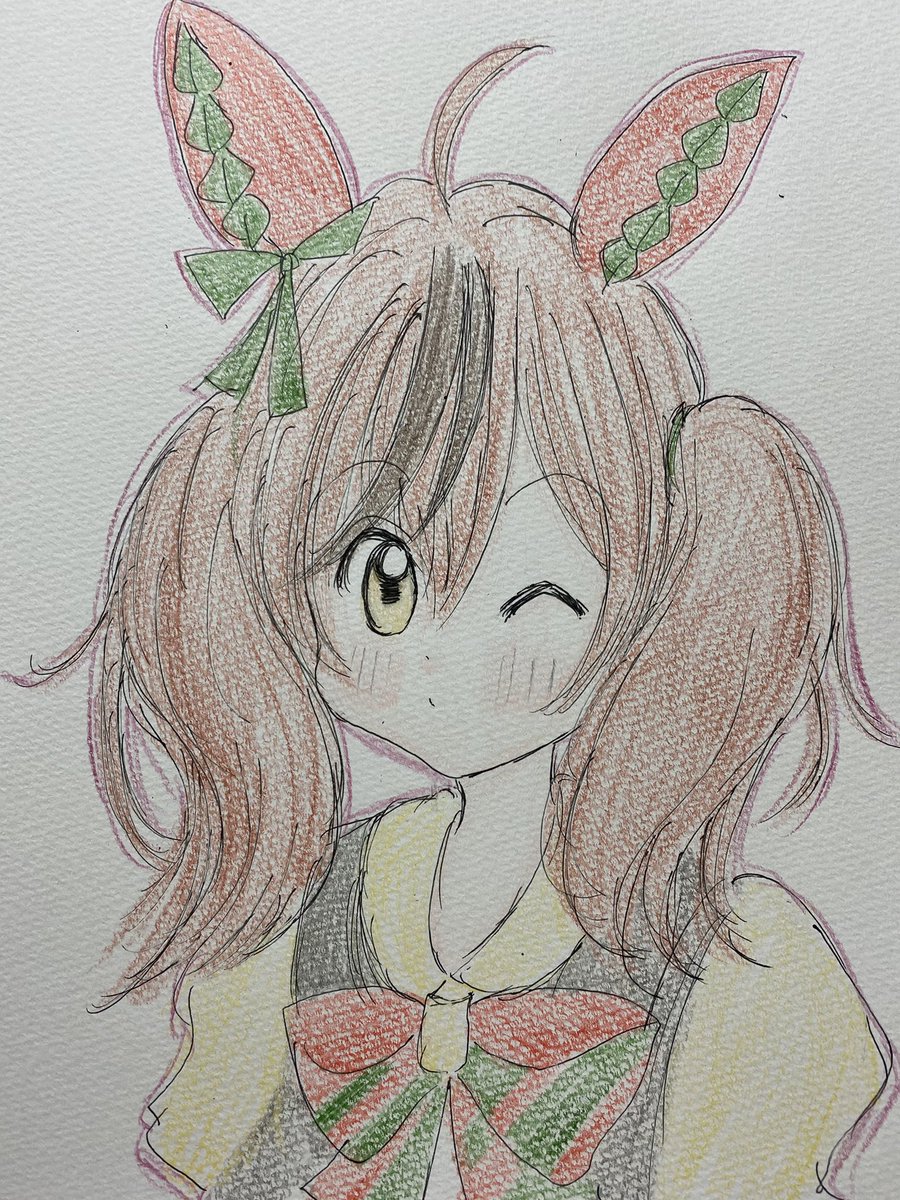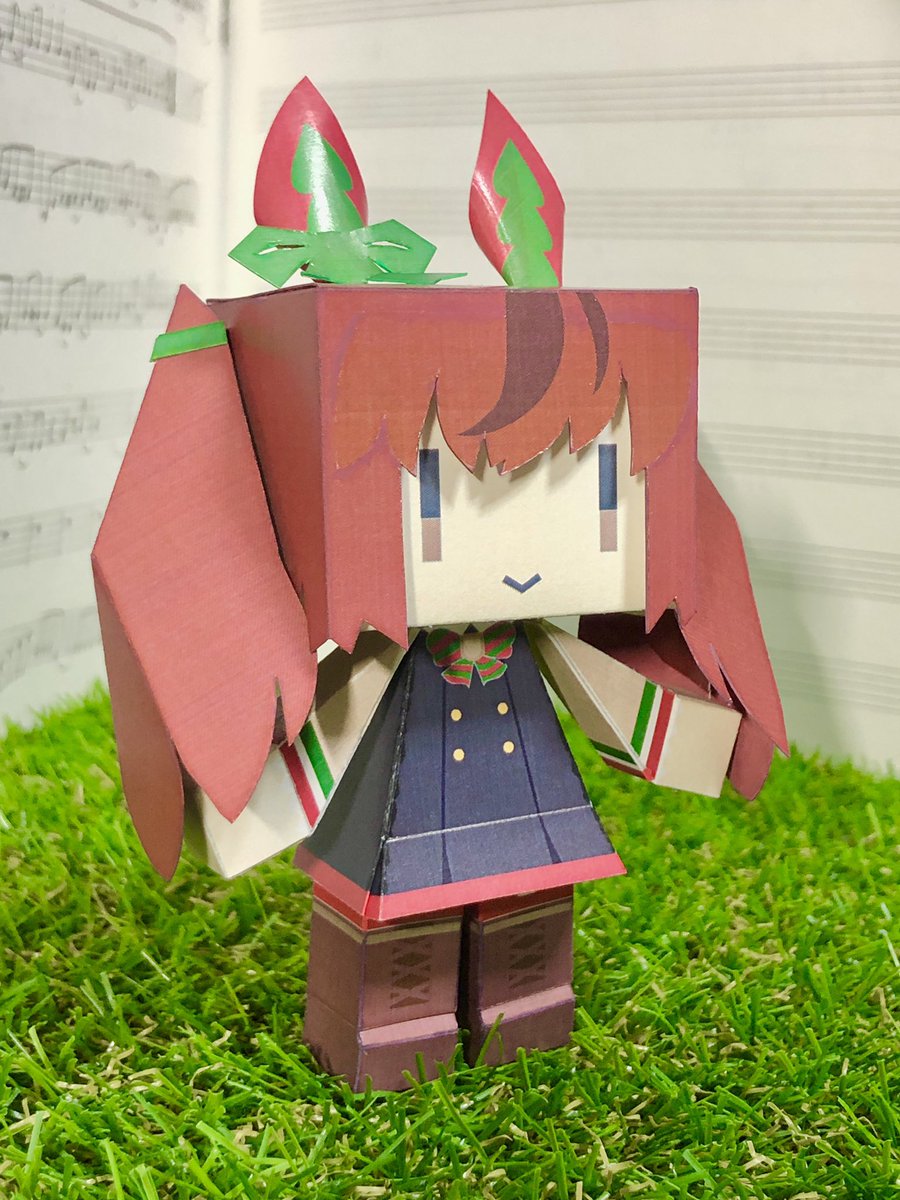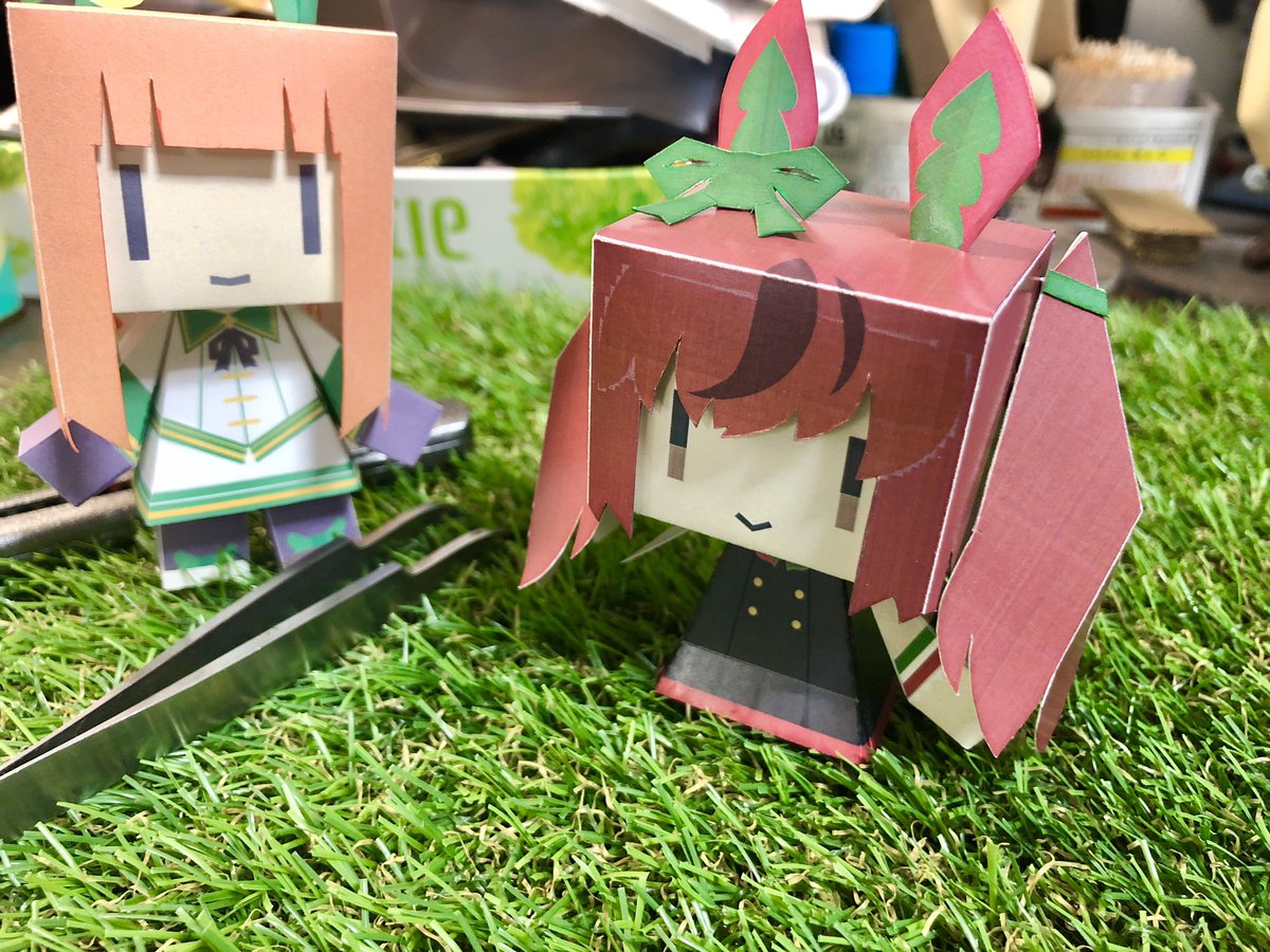 jiuさん(@jiujiu_3 )のナイスネイチャペーパクラフトやっと完成しました。もはやタグ付けるのも憚られる遅刻ぶりですがとりあえず。 紙の断面や折り目を可能な範囲でリタッチ。髪はポスカの青と赤を1:4くらいで混ぜると良い感じ。モフモフの裏側も塗りました。 #ウマ娘 #ナイスネイチャ生誕祭2022
