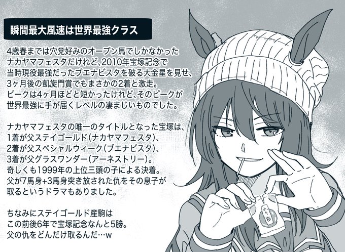父ステイゴールドに似て、意外性の塊だったナカヤマフェスタ。現役最強だったブエナビスタを宝塚で負かし、返す刀で凱旋門賞を2着した数ヶ月間は、紛れもなく世界最強クラスに達していたと思います(ピークが恐ろしく短かったのも勝負師っぽくて良き) #ウマ娘 #ナカヤマフェスタ生誕祭2022