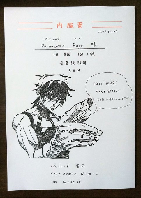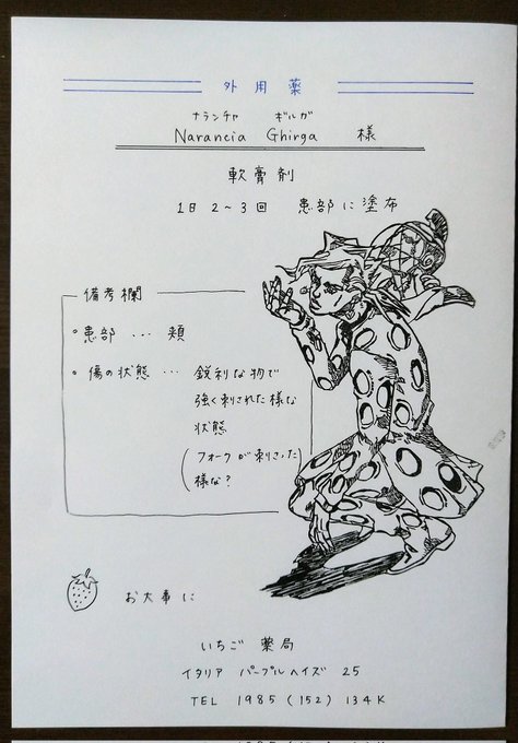 【ナラ誕①】 ナランチャおめでと🥳 護チメン怪我が多いよね😅 通院って気が重いけど、こんな薬局があったら楽しそうだなの図☺️ 🍓の情緒がやや心配…😂 #ナランチャ・ギルガ誕生祭2022 #ナランチャ・ギルガ生誕祭2022 #jjba #消しゴムはんこ
