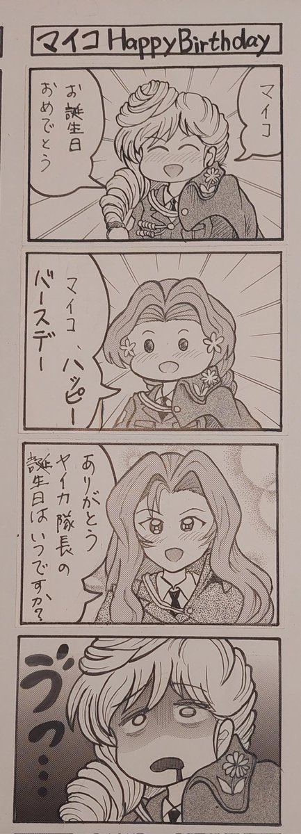 お題「マイコ」 マイコ♥️HAPPY♥️BIRTHDAY♥️ お誕生日おめでとう🎉✨😆✨ ヤイカさん、早く誕生日が設定されますように♥️ #週末ガルパンお絵描き120分一本勝負20230219 #ガルパン四コマ漫画 #マイコ生誕祭2023 #マイコ生誕祭 #週末ガルパンお絵描き120分一本勝負