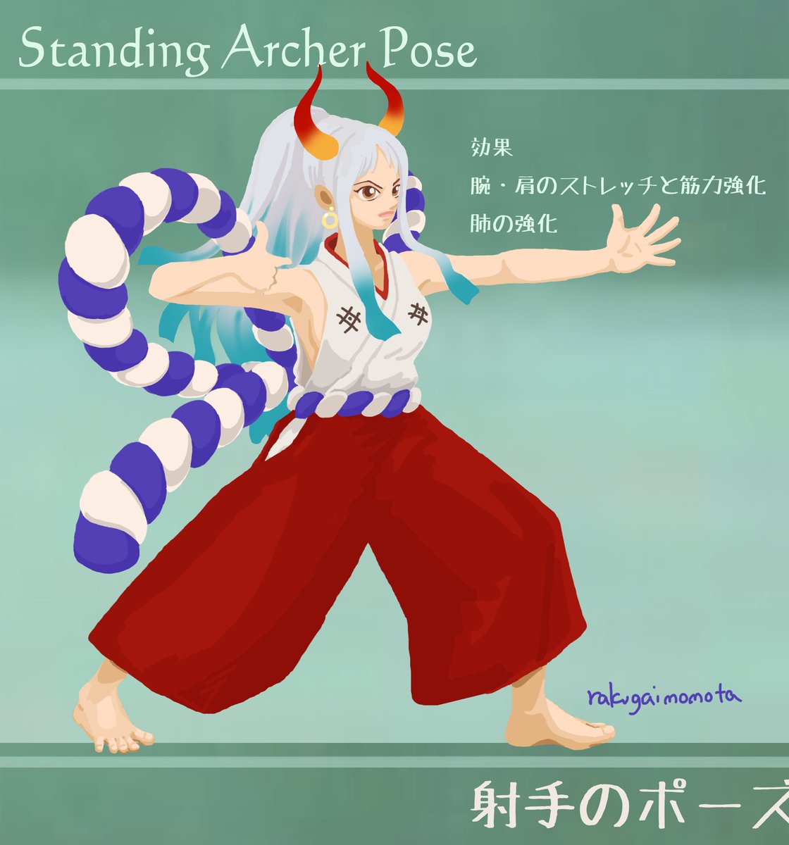 #ヤマト誕生祭2021 ちょ~っと遅れたれど お誕生日おめでとうございます🎉 矢~的~で 本日のおうちヨガしませんか?は #SkyArcherPose #onepiece #ヨガ #イラスト 綱のちょうちょ結び ちょ~面倒だった。 ヤマト坊ちゃんの活躍楽しみ~~