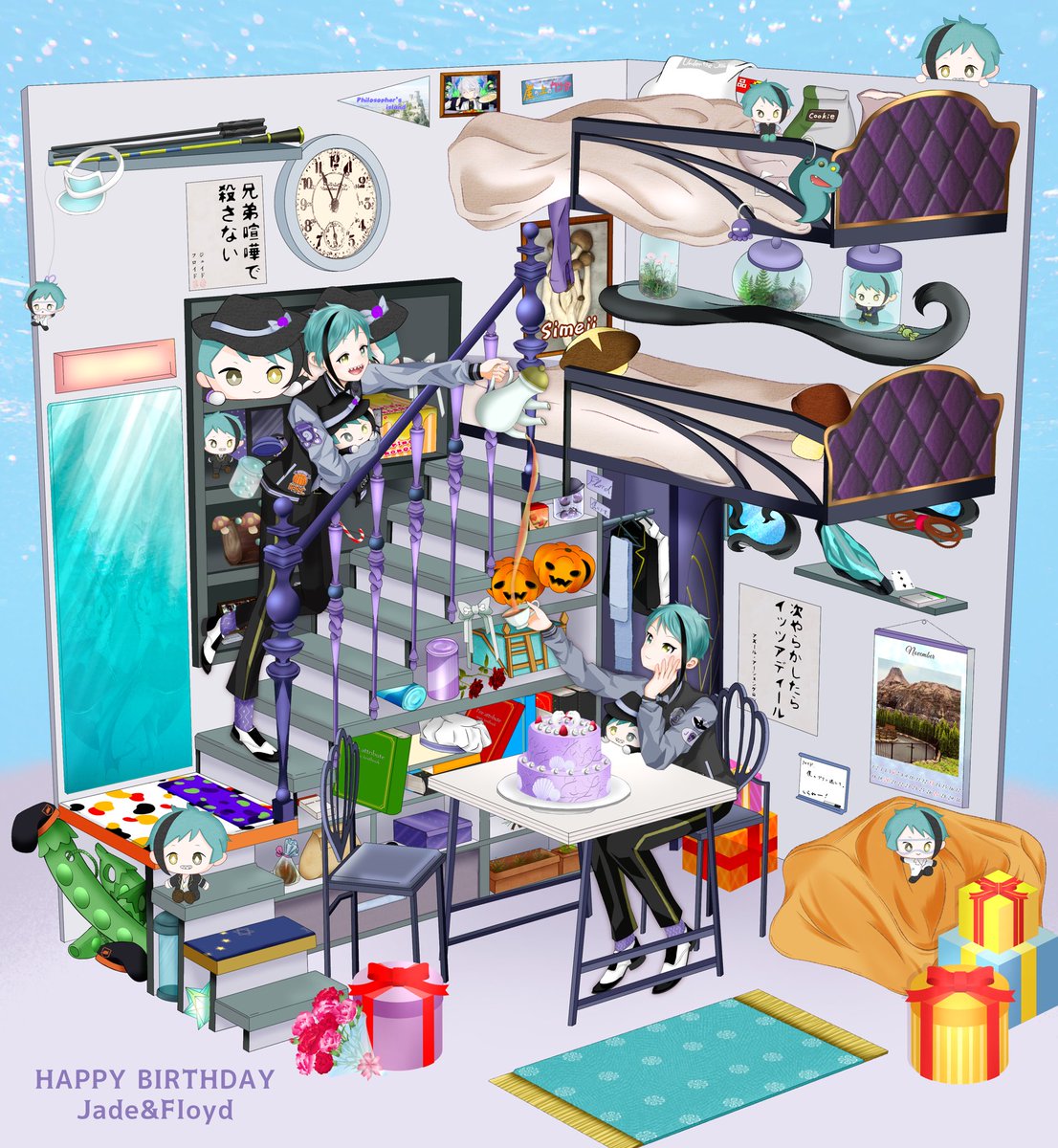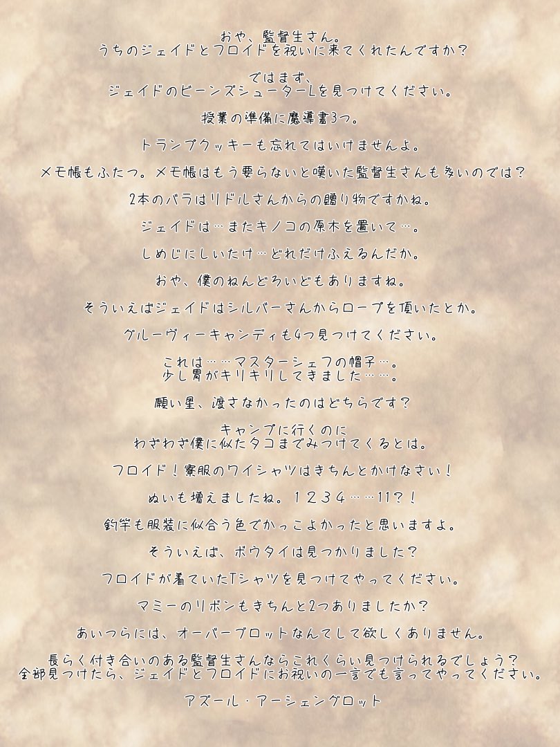 #リーチ兄弟誕生祭2021 #フロイド・リーチ誕生祭2021 #ジェイド・リーチ誕生祭2021 振り回せれることも手を焼かされたこともありましたが、とても楽しかったですよ。 お前たちが生き残ってくれたことを勝手に祝わせてください。 おめでとう、ジェイド、フロイド A.A.