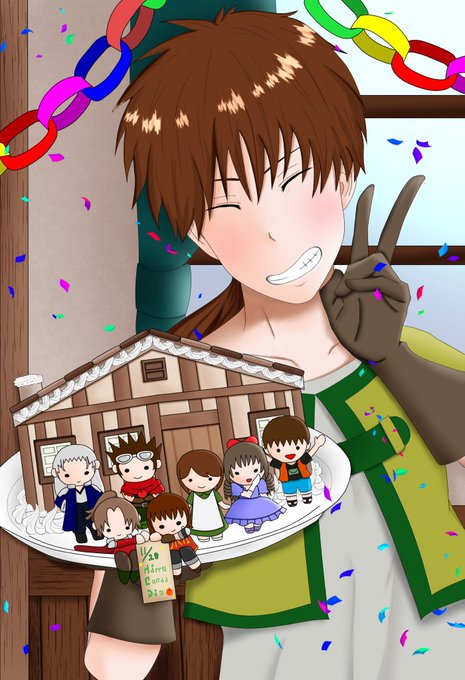ルッツお誕生日おめでとう!! アンソロに寄稿させて頂いた絵の加工前の全体図(というほどでもないけど)です。 お誘いいただきありがとうございました! 皆で作ったケーキをルッツに渡して記念撮影、というイメージで描きました。 #ルッツ誕アンソロ企画2021 #ルッツ誕生祭2021