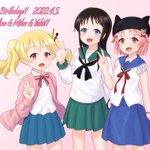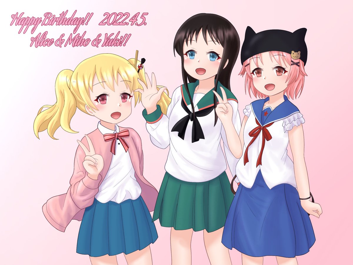 日本大好き英国少女・アリスちゃん、ユタカと仲良し優等生・みぽりん、学園生活部のムードメーカー由紀ちゃん、おめでとう!! #アリス・カータレット生誕祭2022 #kinmosa #野山美歩生誕祭2022 #Aチャンネル #丈槍由紀生誕祭2022 #がっこうぐらし #ゆう誕イラスト #イラスト好きさんと繋がりたい