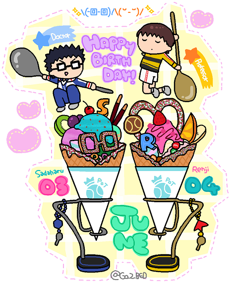 😑「ビタミンCたっぷりいちごのケーキだ、今日は一緒にお祝いしような博士!」 👓「味も美味しいよ教授!」 😑「あっ、こらつまみ食いするんじゃない!💨」 🎊 Happy Birthday 乾&柳 🎂🎉 #乾貞治誕生祭2023 #乾貞治生誕祭2023 #柳蓮二誕生祭2023 #柳蓮二生誕祭2023