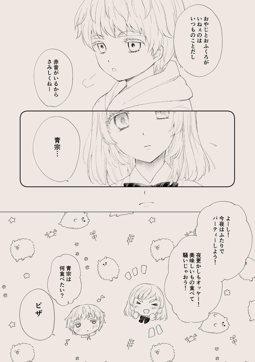 ワカ 「誕生日なのに予定ないの?」 イヌピー 「...ドラケン今日出張してるから」 ワカ 「他に友達居ないの?」 イヌピー 「...ワカくん」 ワカ 「仕方ない晩ご飯おごってやる」 てやりとりありましたかね? 滑り込みっ #乾青宗誕生祭2021 #乾青宗生誕祭2021