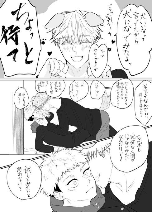 #五悠版イタドリユージ誕生祭2023 #五悠 ゆじお誕生日おめでとう💕 こんなんだけどお祝いの気持ちはいっぱい込めました! ご都合ジュ物を使う5️⃣(1/2) 🐯「あ、あの犬可愛い!いいな〜犬!飼ってみてぇな〜めっちゃ遊びたい。まあ無理だろうけどな〜」 5️⃣「ほぅ…😎」